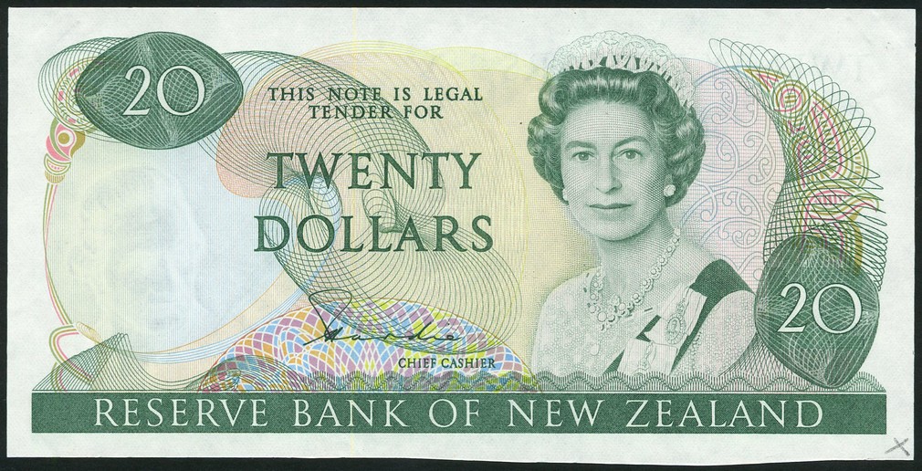 Reserve Bank of New Zealand, $20, ND (1981), no serial numbers, signature H. R. Hardie, green on multicoloured underprint, mature portrait of Queen Elizabeth II at right, reverse miro at left, pigeon at centre