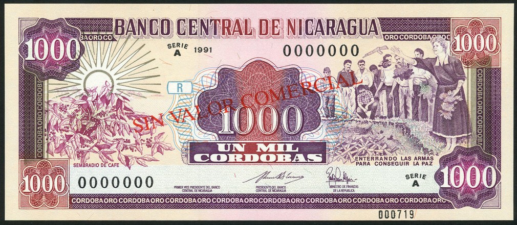 (x) A small group of specimen notes comprising Banco Central de Nicaragua, 500 and 1000 cordobas, 1991, red overprint SIN VALOR COMERCIAL on obverse and reverse, Banco central de Venezuela, 1000 bolivares, 1991 and Banco National de Cuba, 20 peso, 1991