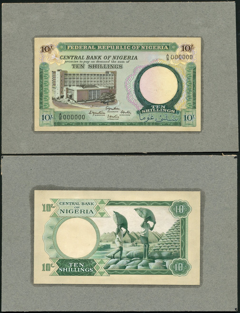 (†) Central Bank of Nigeria, an obverse and reverse composite essay on board for a 10 Shillings, ND (1967), serial number A/B 000000, green and brown on pale blue underprint, bank building at left, value in each corner, reverse green, two men stacking grain sacks