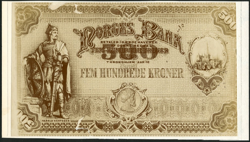 Norges Bank, a printers archival obverse and reverse photograph for a proposed issue of 500 kroner, Trondhjem, 18-, sepia, Harald Harfager at left, cathedral view top right, medallic male head low centre, reverse arms