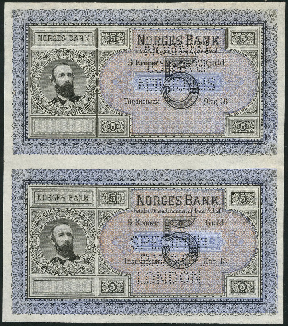 (†) Norges Bank, specimen 5 kroner, Trondhjem, 18- (ca 1877), blue and black and brown, King Oscar II at left, value in field at right, reverse blue, medallic king's head at left, arms at right, value at centre