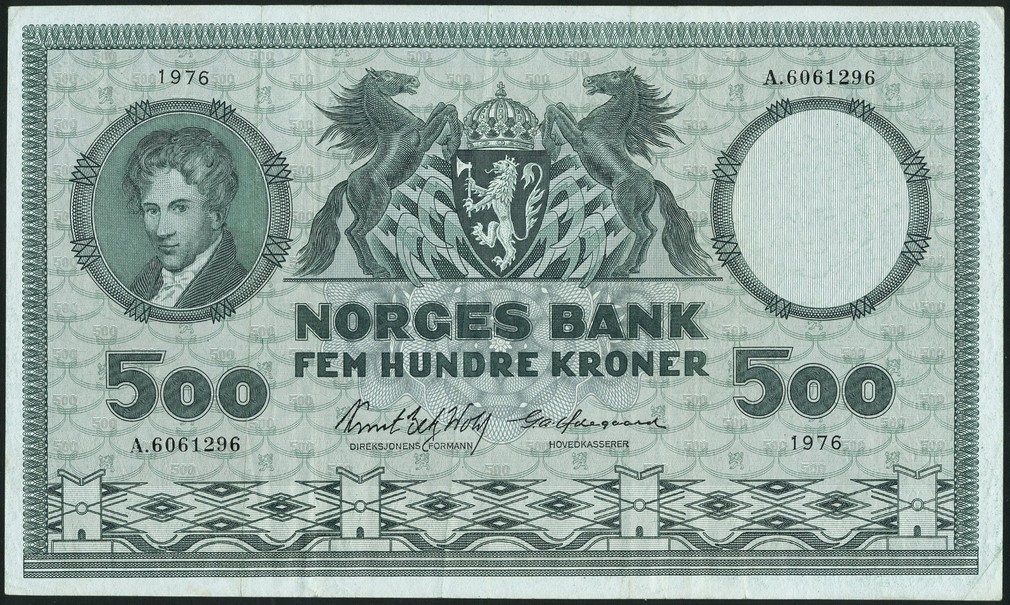 (x) Norges Bank, 500 Kroner, 1976, serial number A.6061296, dark green, portrait of Neils Henrik Abel at left, crowned coat of arms at centre, industrial workers on reverse