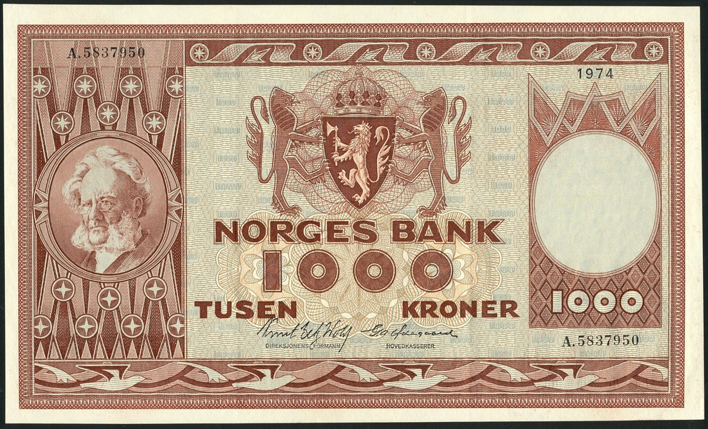 (x) Norges Bank, 1000 Kroner, 1974, serial number A. 5837950, red-brown on green underprint, Henrik Ibsen at left, crowned arms at centre, elderly man and child on reverse