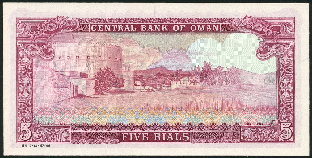 Central Bank of Oman, an altered design for a 5 rials, c.1987, laid over a real note of 1977, front pasted onto card, reverse red, Jalali Fortress at left, clouds at top right layered with extra paper and ink