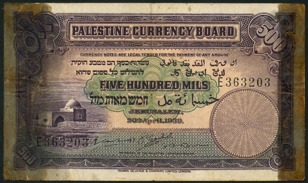 (x) Palestine Currency Board, 500 mils, 20 April 1939, serial number E363203, purple, black and green, Rachels Tomb at Bethlehem at left, value at each corner, reverse purple, Tower of David at centre