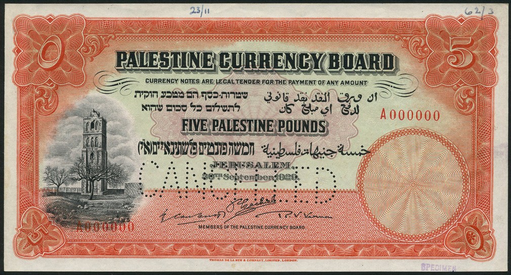 (†) Palestine, Currency Board, specimen £5, 30 September 1929, red serial number A000000, red-orange and pale green, the White tower, Ramleh, at left, value in pale lilac guilloche at centre, value at each corner, three printed signatures of the Members of the Palestine Currency Board at centre, Sir John Caulcutt, Sir Percy Ezechiel and Roland Venables Vernon, reverse red-orange, the Citadel of Jerusalem with Tower of David at centre, value at left and right and low centre