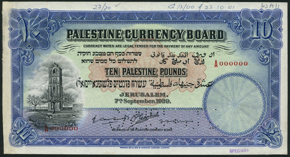 (†) Palestine Currency Board, specimen £10, 20 April 1939, red serial number A 000000, blue and black on pale green underprint, a light brown central guilloche, the White Tower at Ramleh at left, Caulcutt, Ezechiel and Downie signatures, reverse the Citadel of Jerusalem and the Tower of David