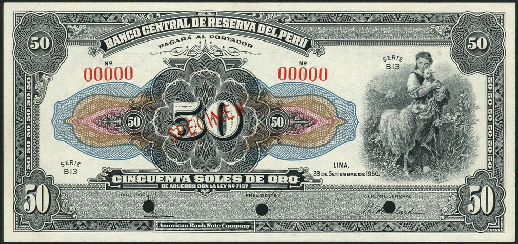 (x) Banco Central de Reserva del Peru, a group of specimens comprising 1 sol, 26 October 1935, serial number B 00000, 10 soles, 17 October 1947, serial number C41 00000, 50 soles, 28 September 1950, serial number B13 00000, 100 soles, 28 September 1950, A3 00000, all with red specimen overprint and cancellation holes