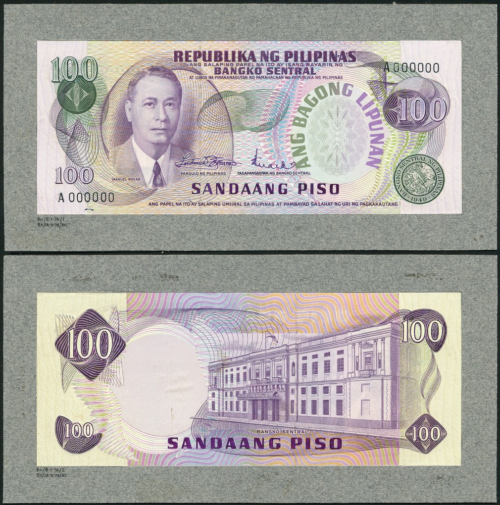 (†) Bangko Sentral ng Pilipinas, an obverse and reverse composite essay on card for a 100 Piso, ND (1976), serial number A 000000, purple and green on multicoloured underprint, Manuel Roxas at left, value in three corners, "ANG BAGONG LIPUNAN" around watermark area, reverse the former central bank building at centre right, value in each corner