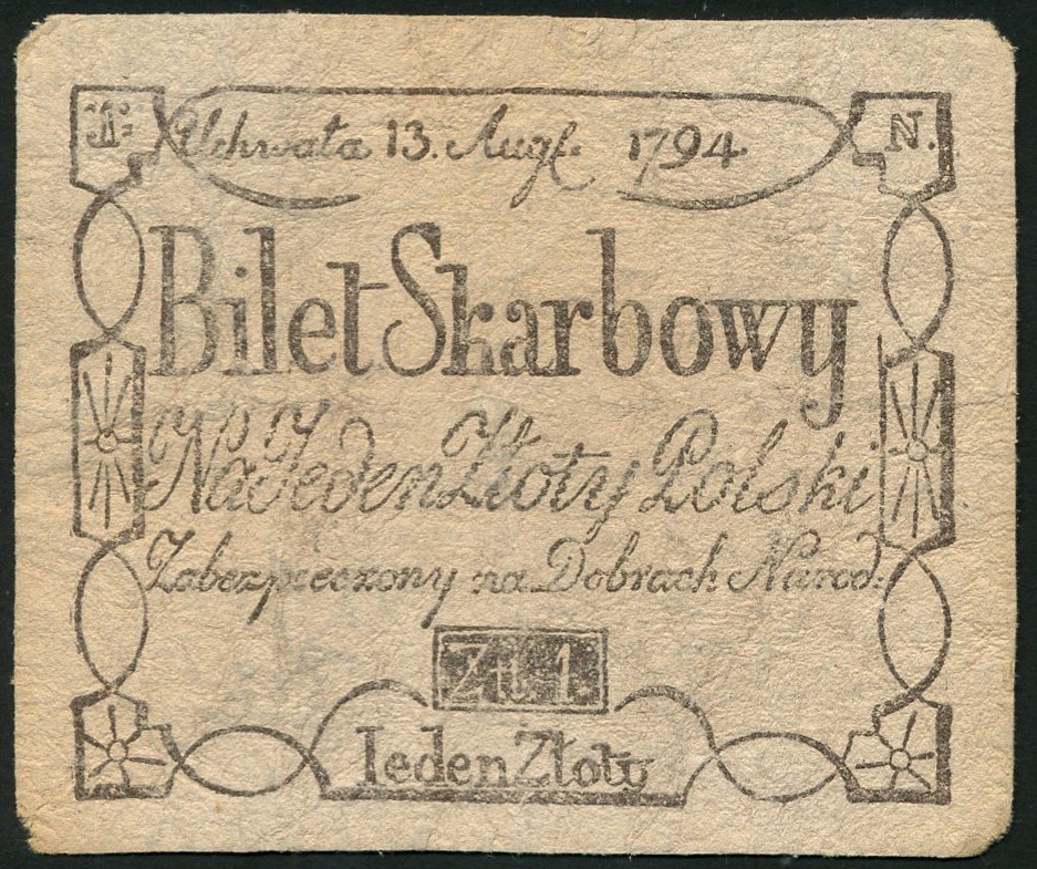 Poland Supreme National Council, second issue 5 grozy, 13 August 1794, no serial number or signature, black on white card, arms of Poland and Lithuania at centre, imperforated oil mark, 1 zloty, forgery plate note, F. Malinowski on reverse