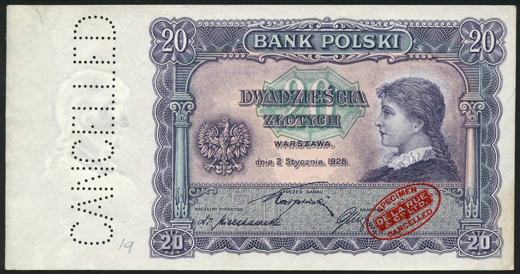 (†) Bank Polski, specimen 20 zlotych, 2 January 1928, purple, pale pink and green, girl at right, arms at left, column at left and right, three printed signatures below, reverse pale purple and green, lake and mountains