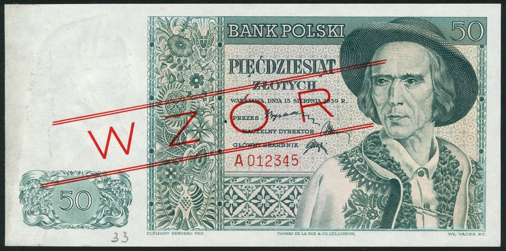 (†) Bank Polski, specimen 50 zlotych, 15 January 1939, red serial number A 012345, green and pink, man in national costume at right, reverse green and pink, trees and mountain valley