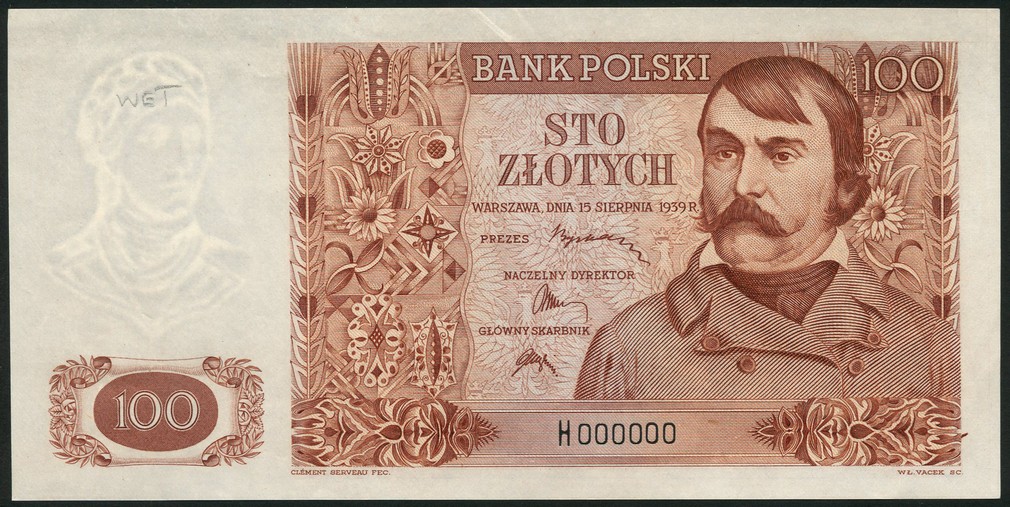 (†) Bank Polski, specimen/proof 100 zlotych, 15 January 1939, serial number H 000000, dark brown, man with moustache at right, together with another example in a lighter brown colouring