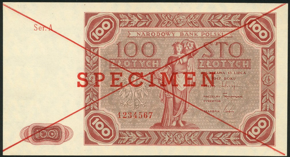 Polish National Bank, specimen 100 zlotych, 1947, red serial number A 1234567, dark red, maiden at centre with apples reverse red, horses