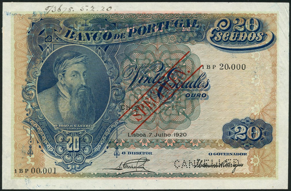 (†) Banco de Portugal, specimen 20 escudos, 7 July 1920, serial number 1BP 00001-1BP 20000, blue and brown and green, Don Joao de Castro at left, value in field, reverse purple and multicoloured, building at centre, arms within wreath at right