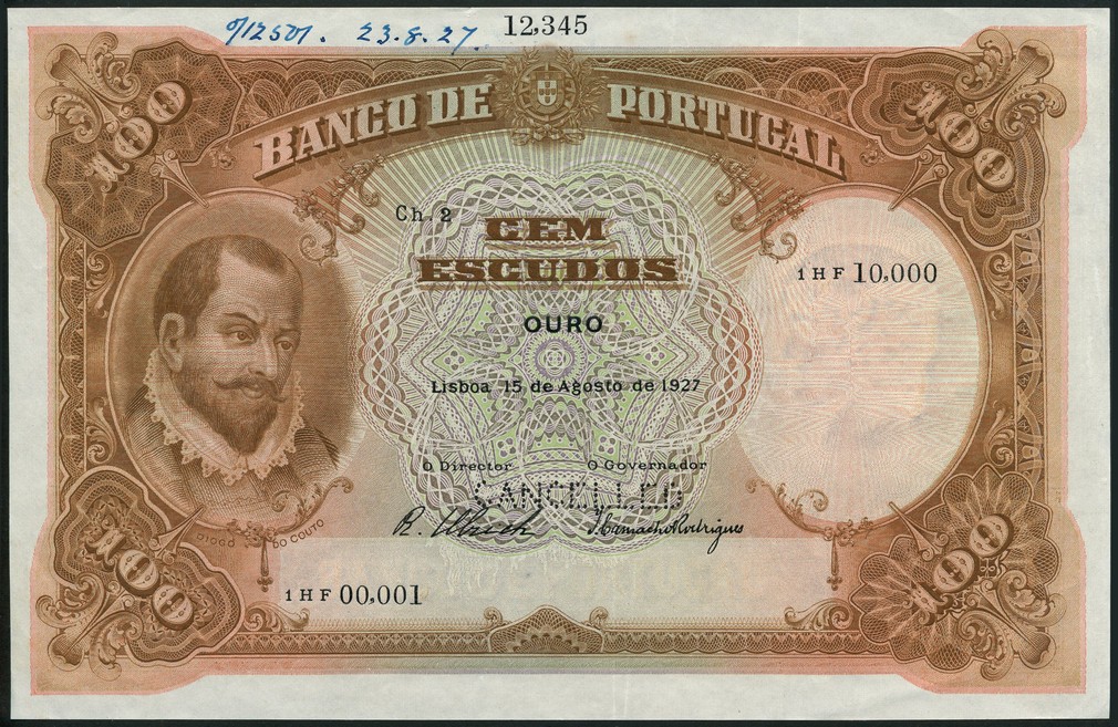 (†) Banco de Portugal, specimen 100 escudos, 15 August 1927, serial number 1HF10,000 Ch.2, brown, pale green and lilac, Diogo do Couto at left, arms top centre, value at centre and at each corner, two printed signatures below, reverse, purple and green, castle at centre, value at left and right