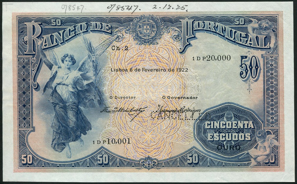 (†) Banco de Portugal, specimen 50 escudos, 6 February 1922, serial number 1 DP 10001-20000, blue and pale orange and lilac, Victory at left, arms top centre, cherub low right, reverse purple and green, maiden and lions low right, value in field