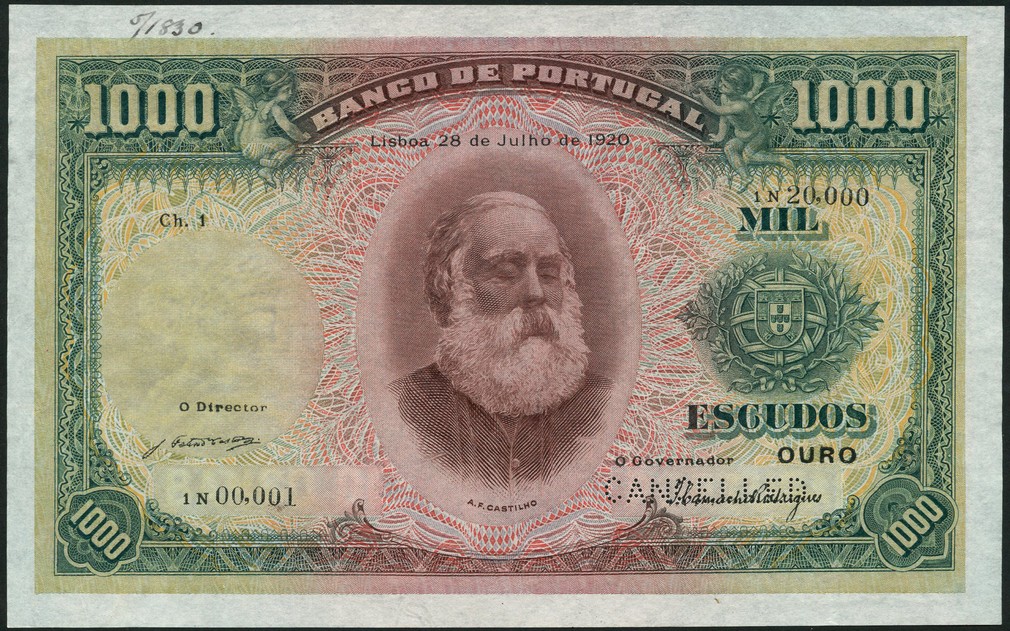(†) Banco de Portugal, specimen 1000 escudos, 28 July 1920, serial number 1N20,000 Ch.1, purple and green and orange, A F Castillo at centre, arms at right, value at left and right, two printed signatures in field, reverse, purple-pink, allegorical maidens at centre, value at left and right, cherub top left and right