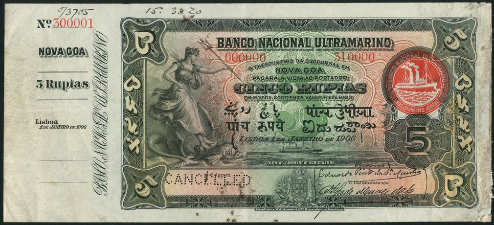 (†) Banco Nacional Ultramarino, Portuguese India, printer's archival specimen 5 Rupias with counterfoil, 1 January 1906, serial run 000000 to 310000, black and green on pink underprint, allegorical woman with trident standing on a hippocamp at left, value at centre and in each corner, steamship seal Type III at upper right, reverse blue and orange, helmeted female at centre, value in ornate guilloches on each side, perforated CANCELLED
