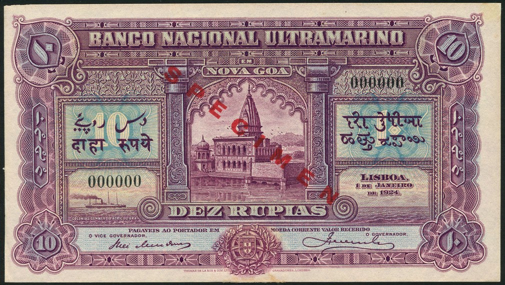 (x) Banco Nacional Ultramarino, Portuguese India, specimen 10 rupias, 1 January 1924, zero serial numbers, purple and lilac, temple at centre, steamship low left, arms low centre, value at left and right in pale blue underprint, and at each corner, signatures of Ulrich and Monteiro de Mendonca, reverse, purple, tiger at centre, value at left and right