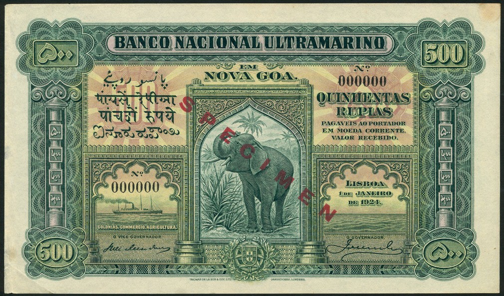 (x) Banco Nacional Ultramarino, Portuguese India, a specimen 500 rupias, 1 January 1924, black zero serial numbers, green and multicoloured, elephant at centre, steamship low left, column at left and right, arms low centre, signatures of Ulrich and Monteiro de Mendonca, reverse green, galleon at centre, value at left and right