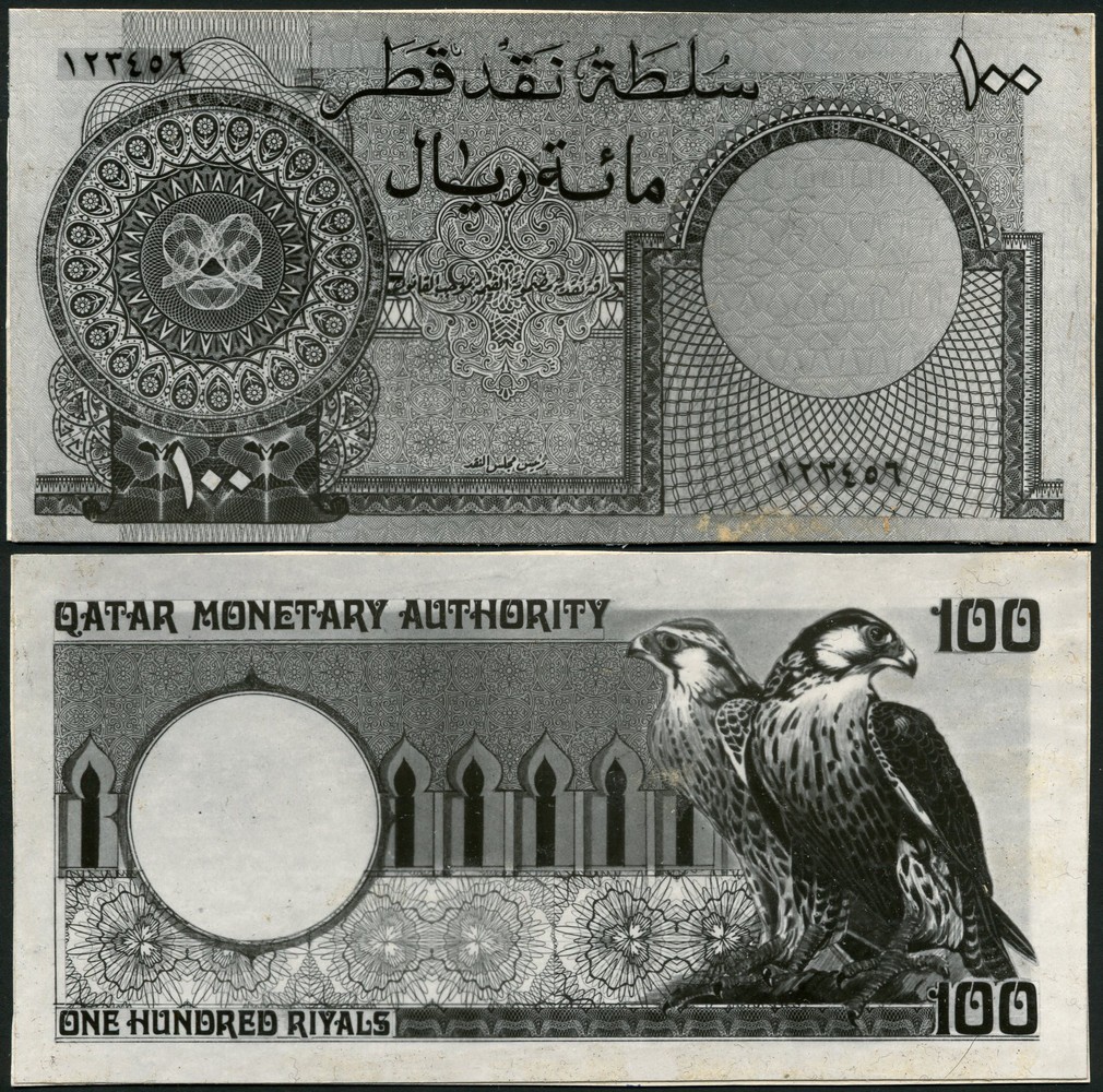 Qatar Monetary Authority, an obverse and reverse archival photograph for a 100 riyals, ND (ca 1972), serial number 123456, ornate engine turnings as background, value low left and top right, reverse ornate archways, falcons at right
