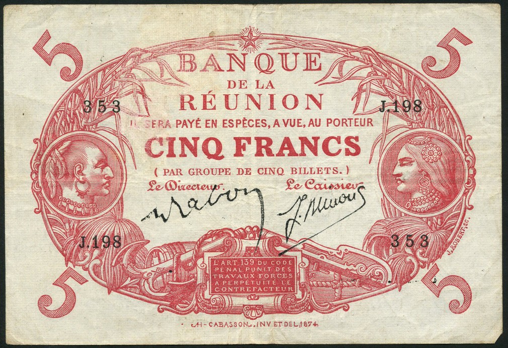 Banque de la Reunion, 5 francs, Cabasson, ND (1912-1944), red and white, indigenous head at left and right, also 25 francs, ND (1930-1944), multicoloured, woman at centre
