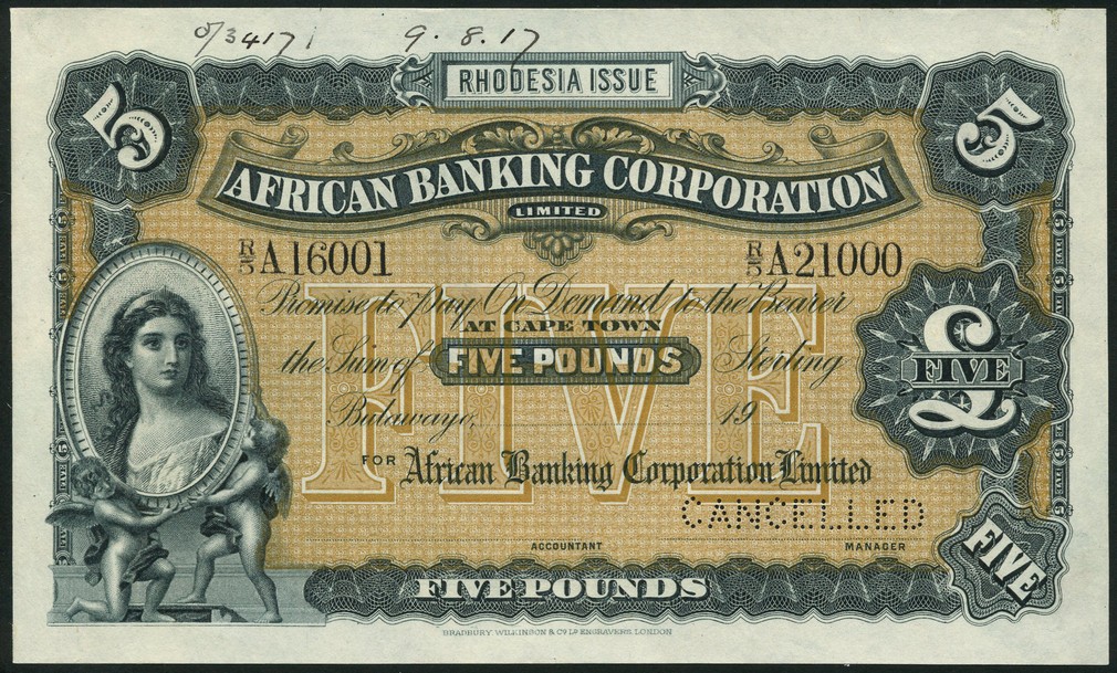 (†) African Banking Corporation, Rhodesia, printer's archival specimen £5, Rhodesia Issue, Bulawayo, 19-, serial number run R/5A 16001 to R/5A 21000, black on ochre underprint, cherubs holding allegorical woman's portrait at lower left, value in guilloche at right and in three corners, reverse brown, map of Africa at centre, value on either side and in each corner, perforated CANCELLED