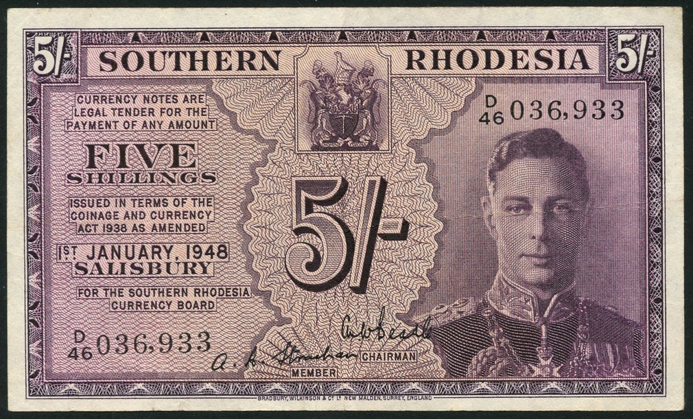 (x) South Rhodesian Currency Board, 5 shillings, 1 January 1948, serial number D46 036,933, purple, portrait King George VI at right, value top right and left and at centre, reverse, value in ornate vignette at centre