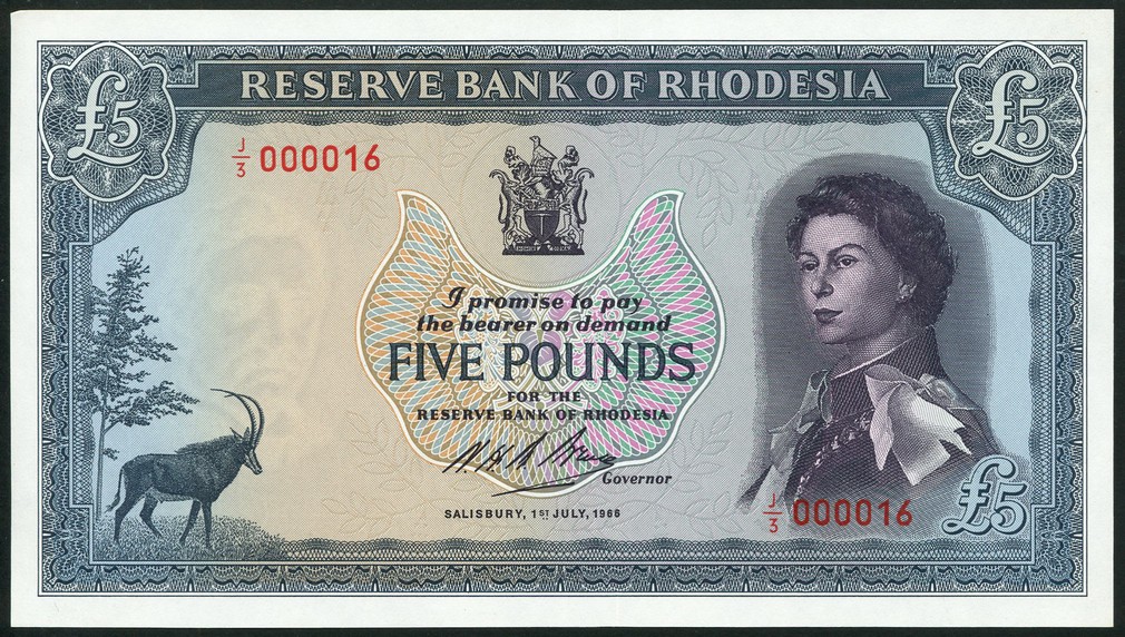 Reserve Bank of Rhodesia, 10 shillings, blue, £1, red and £5, blue-grey, all June/July 1966, serial numbers L/10 000016,K/17 000016 and J/3 000016 respectively, Elizabeth II at right, Bruce signature