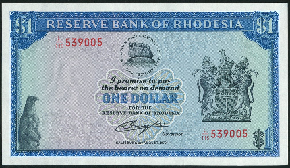 Reserve Bank of Rhodesia, $1 (9), 2 August 1979 (last date for type), consecutive serial numbers L/115 539001/9, blue and multicolour underprint, bank logo top centre, arms at right, reverse, tobacco field at centre, mountains in background, also Reserve Bank of Zimbabwe, $2 (5), Harare 1983, consecutive serial numbers AB0825201T/5T, blue on multicolour, water buffalo at left, Chiremba balancing rocks at right, reverse, tiger fish at centre, Kariba Dam and reservoir at right