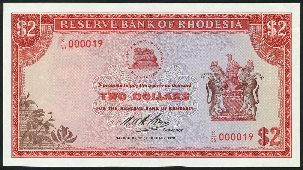 Reserve Bank of Rhodesia, $2, 17 February 1970, serial number K/35 000019, red, arms at right