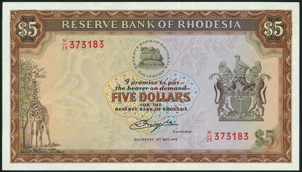 Reserve Bank of Rhodesia, $5 (9), all 15 May 1979, consecutive serial numbers M/23 373182-88, and M/22 533087-89, brown on multicolour underprint, giraffe at left, bank logo upper centre, arms at right, reverse lion and lioness at centre, a very desirable group given the serial numbers