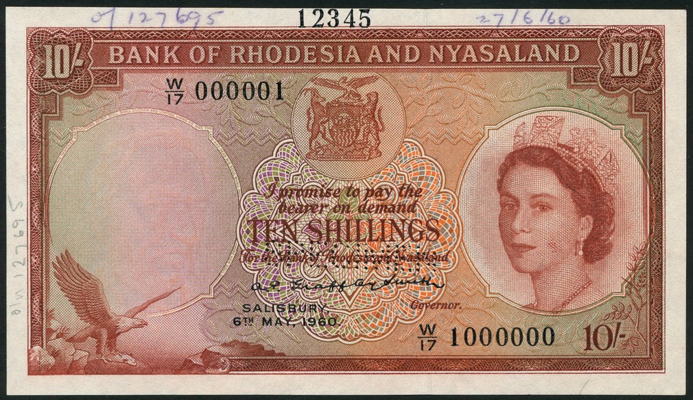 (†) Bank of Rhodesia & Nyasaland, printer's archival specimen 10 Shillings, 22 April 1960, serial run W/16 000001 to W/16 1000000,W/17 000001-W/17 1000000, signature Graffety-Smith, reddish brown on multicoloured underprint, portrait of Queen Elizabeth II at right, arms at upper centre, reverse river scene, perforated SPECIMEN