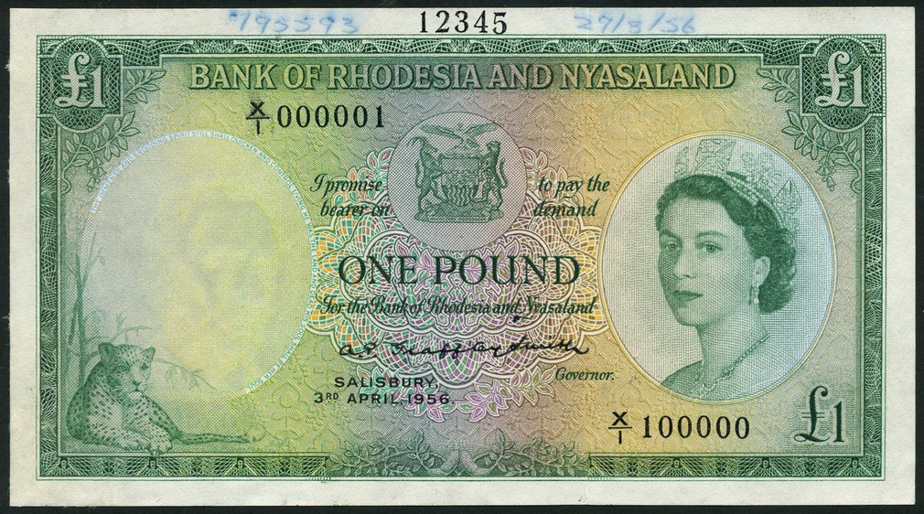 (†) Bank of Rhodesia & Nyasaland, printer's archival specimen £1 (2), 3 April 1956, serial run X/1 000001 to X/1 1000000, X/1 100001-X/1 1000000, signature Graffety-Smith, green on multicoloured underprint, portrait of Queen Elizabeth II at right, arms at upper centre, reverse Zimbabwe ruins, perforated SPECIMEN