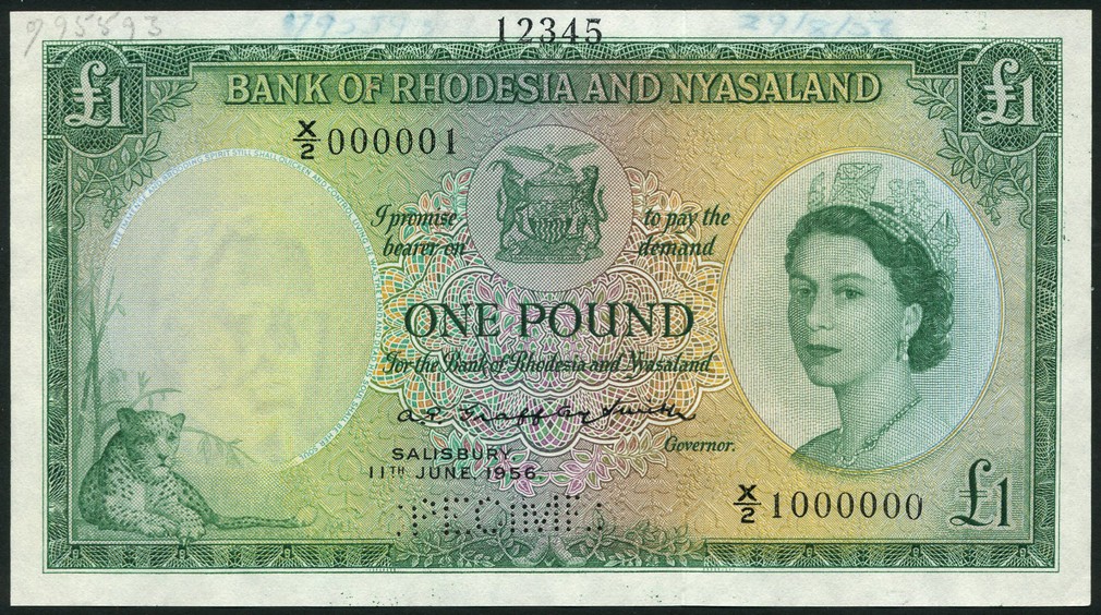 (†) Bank of Rhodesia & Nyasaland, printer's archival specimen £1 (2), 11 June 1956, serial run X/2 000001 to X/2 1000000, X/3 000001-X/3 1000000 signature Graffety-Smith, green on multicoloured underprint, portrait of Queen Elizabeth II at right, arms at upper centre, reverse Zimbabwe ruins, perforated SPECIMEN