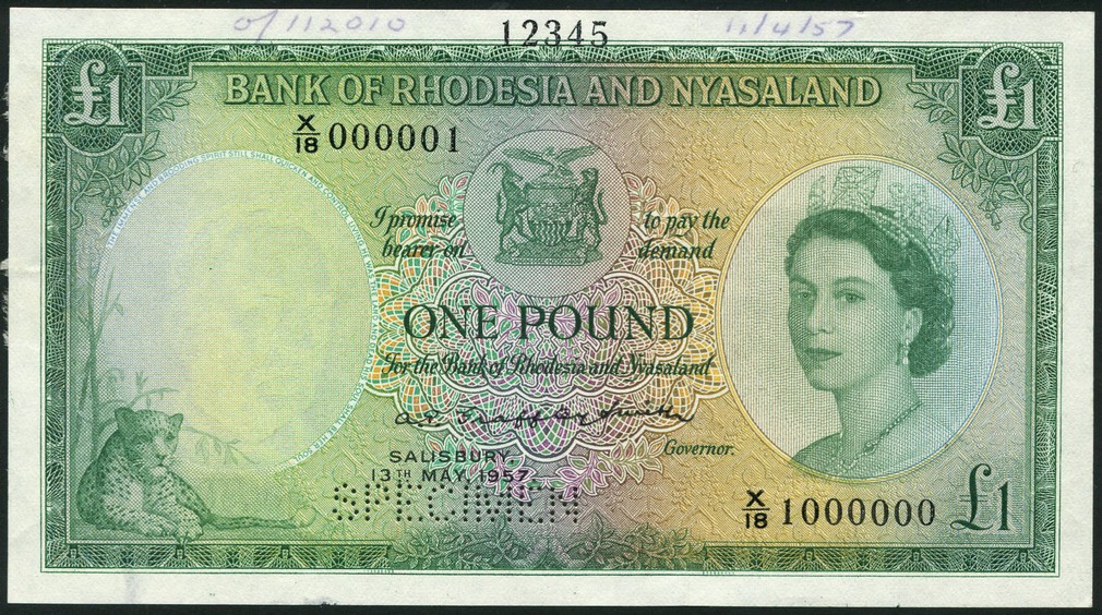 (†) Bank of Rhodesia & Nyasaland, printer's archival specimen £1, 13 May 1957, serial run X/18 000001 to X/18 1000000, signature Graffety-Smith, green on multicoloured underprint, portrait of Queen Elizabeth II at right, arms at upper centre, reverse Zimbabwe ruins, perforated SPECIMEN