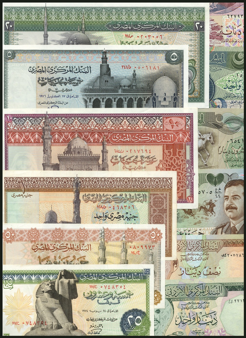 (x) mixed group of modern issue notes comprising, Central Bank of Egypt, 25 piastres, 50 piastres, £1, £5, £10, £20, The Arab Republic of Egypt Currency Note, 5 and 10 piastres, Central Bank of Iraq, 1/4, 1/2, 1, 5, 10, 25 (2) dinars, and Central Bank of Jordan, 1/2 and 1 dinar