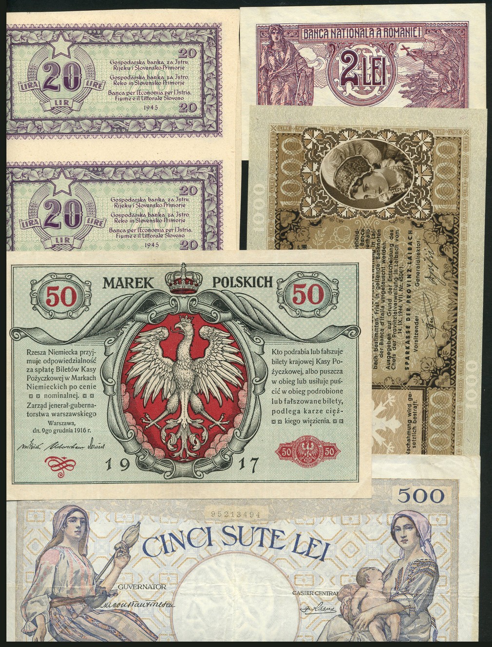 (x) Poland, Romania, Yugoslavia, 50 marek, 1917, pale blue-grey and red, Romania, 500 lei, 1938, multicoloured, 2 lei, 1938, purple, and Yugoslavia, a sheet of four 20 lir, 1945 and 1000 lir, 1944, brown, girl at left