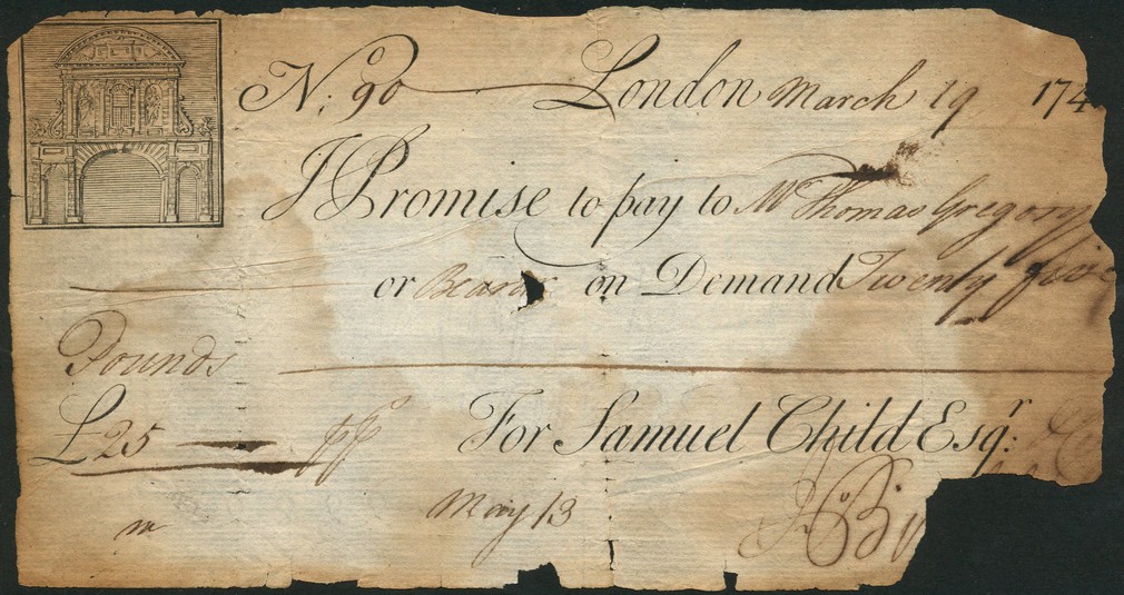 Sir Francis Child, bearer note for £25, 19 March 174(?), serial number 90, black and white, gateway into City of London at Temple Bar at top left