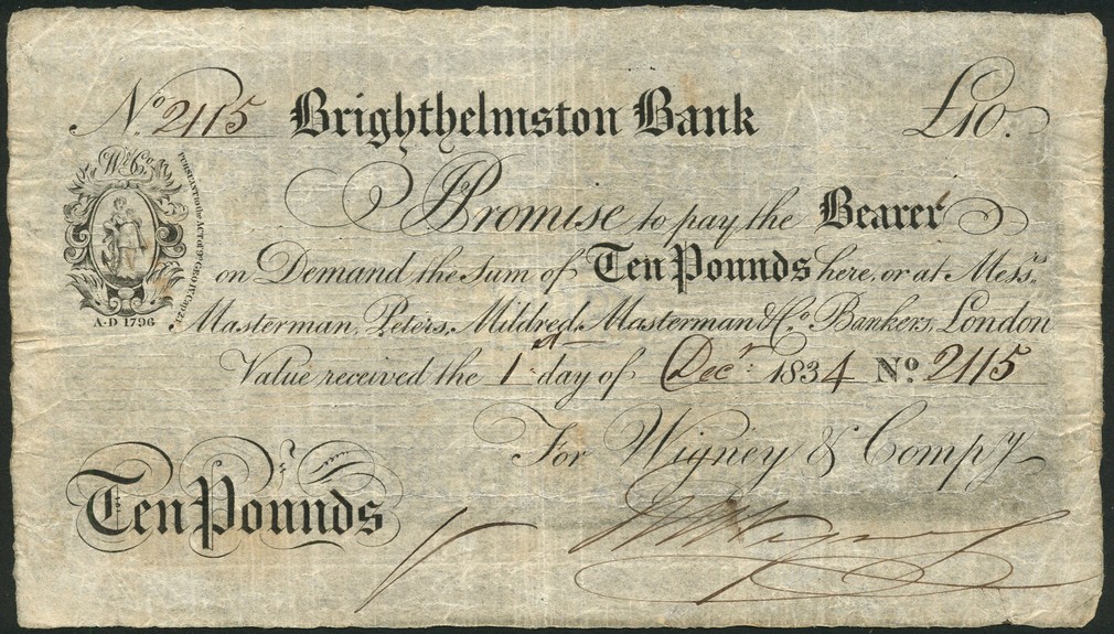 Brighthelmstone Bank (Wigney & Compy.), £10, 1 January 1834, serial number 2115, black and white, maiden and anchor within oval frame top left, manuscript signature of William Wigney low right