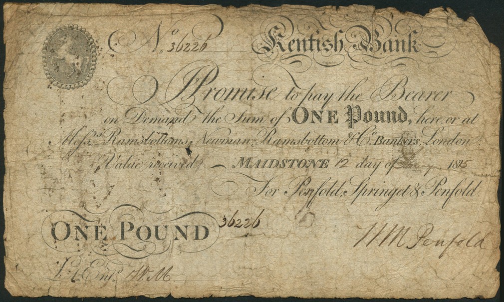 Kentish Bank (Penfold, Springer & Penfold), £1, 12 January 1915, serial number 36226, black and white, white horse at top left, also Rochdale Bank (Clement Royds & Compy), unissued £5 (3), 183-, black and white, Saint George slaying the dragon at top left