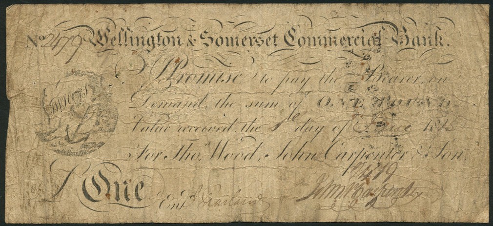 Wellington and Somerset Commercial Bank, £1, 1 June 1815, serial number 2479, black and white, arms at left, for Wood, Carpenter and Son, signed by Carpenter