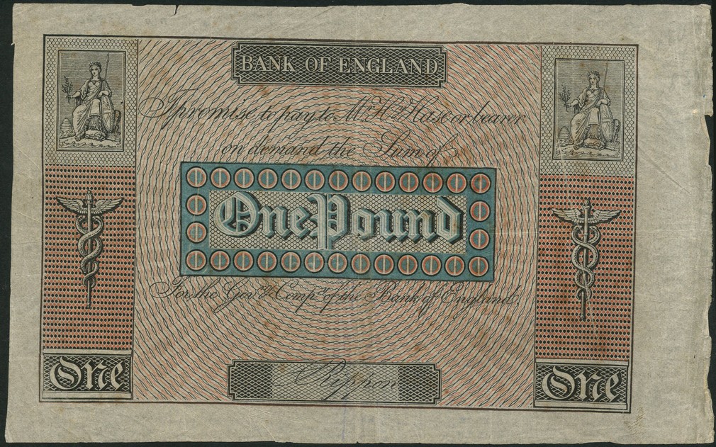 Applegarth and Cowper, a trial £1, ND (ca 1818), blue, pink and red, Britannia top left and right, 'pay to Henry Hase' in text top centre, RIPPON in tablet low centre, value in red central tablet, caduceus at left and right