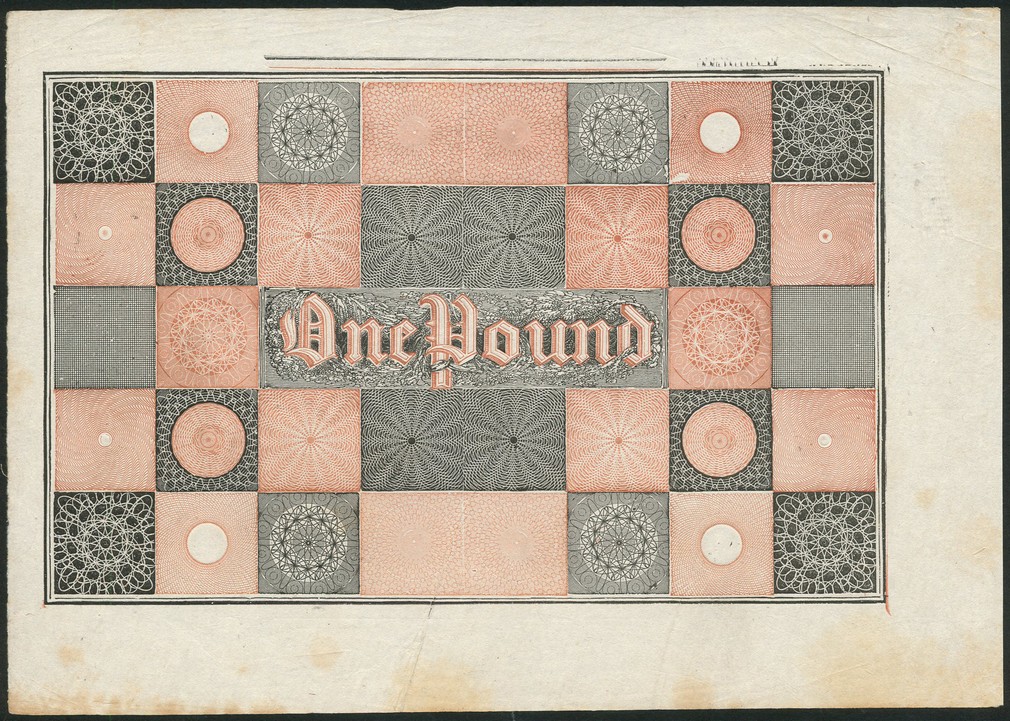 Applegarth and Cowper, a trial £1, ND (ca 1818), pink and grey, value at centre, background of squares and engine turnings