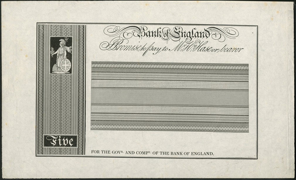 Applegarth and Cowper, a trial £5, ND (ca 1818), black, grey and white, Britannia top left, 'Bank of England' and pay to Henry Hase' in text top centre
