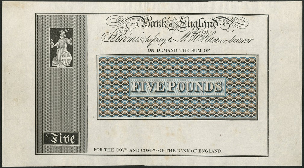 Applegarth and Cowper, a trial £5, ND (ca 1818), black, grey and white with a blue and brown central panel, Britannia top left, 'Bank of England' and pay to Henry Hase' in text top centre, reverse a blue and brown central panel