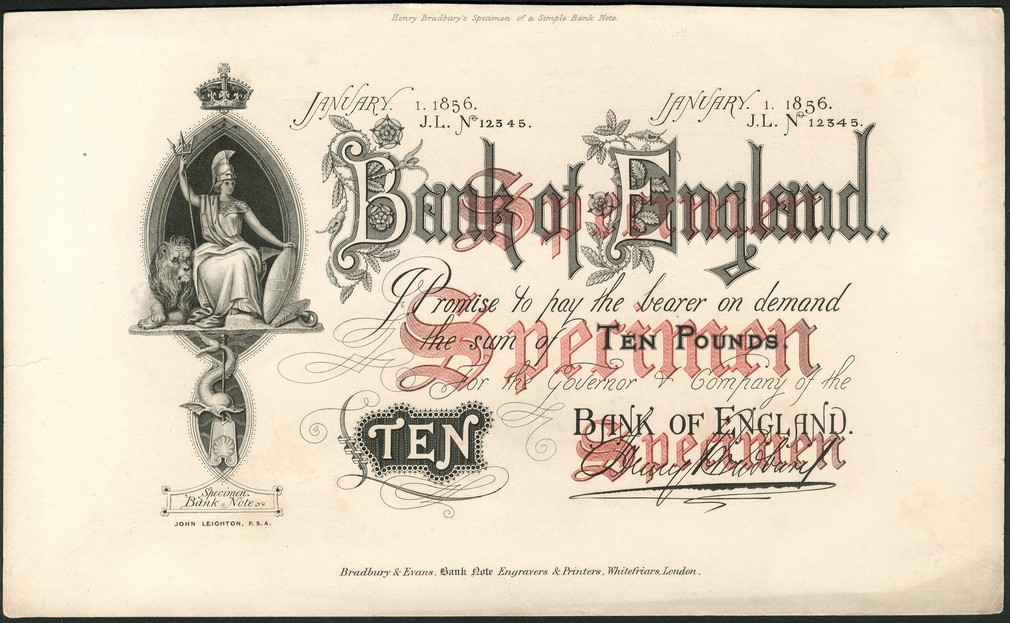 Bank of England, Bradbury & Evans, specimen £10, 1 January 1856, serial number 12345, uniface, black on cream, seated Britannia and lion at left, red Specimen overprint top, centre and low right