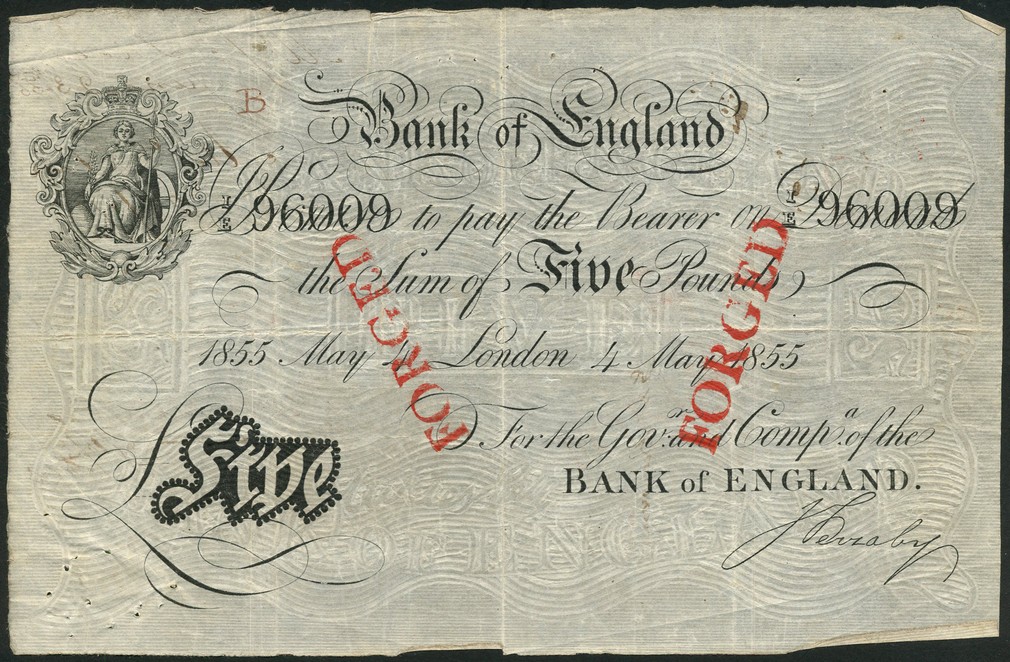 (†) Bank of England, M. Marshall, forged £5, London, 4 May 1855, serial number I/E 96009, black and white, crowned vignette of Britannia at top right, value in tablet at low left, two red FORGED handstamps