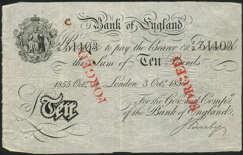 (†) Bank of England, M. Marshall, forged £10, London, 3 October 1855, serial number J/B 51403, black and white, crowned vignette of Britannia at top right, value in tablet at low left, two red FORGED handstamps
